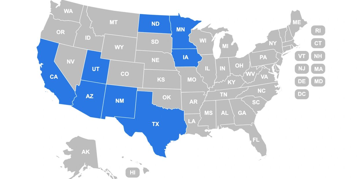 Texas, New Mexico, Arizona, California, Utah, North Dakota, Minnesota and Iowa